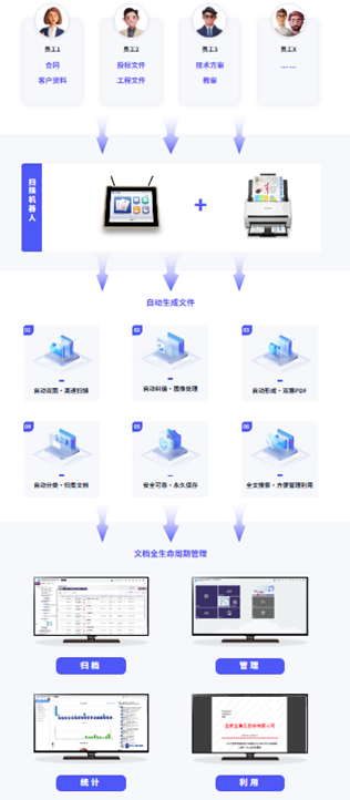 多套掃描機(jī)器人,猶如毛細(xì)血管,分散歸置于組織內(nèi)各單元,輻射所有成員,每個(gè)人均可依授權(quán),快速掃描上傳文檔。